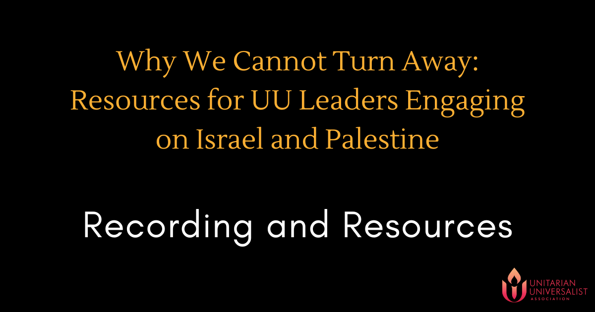 We are grateful for the presence of so many hundreds of people at the November 6 event, “Why We Cannot Turn Away: Resources for UU Leaders Engaging Palestine & Israel.” We apologize for the delay in release of these materials, although unfortunately the violence in the region continues and these conversations are very much still ongoing. We hope you will find these resources helpful for both your own learning and reflection and that of your congregations and communities.
